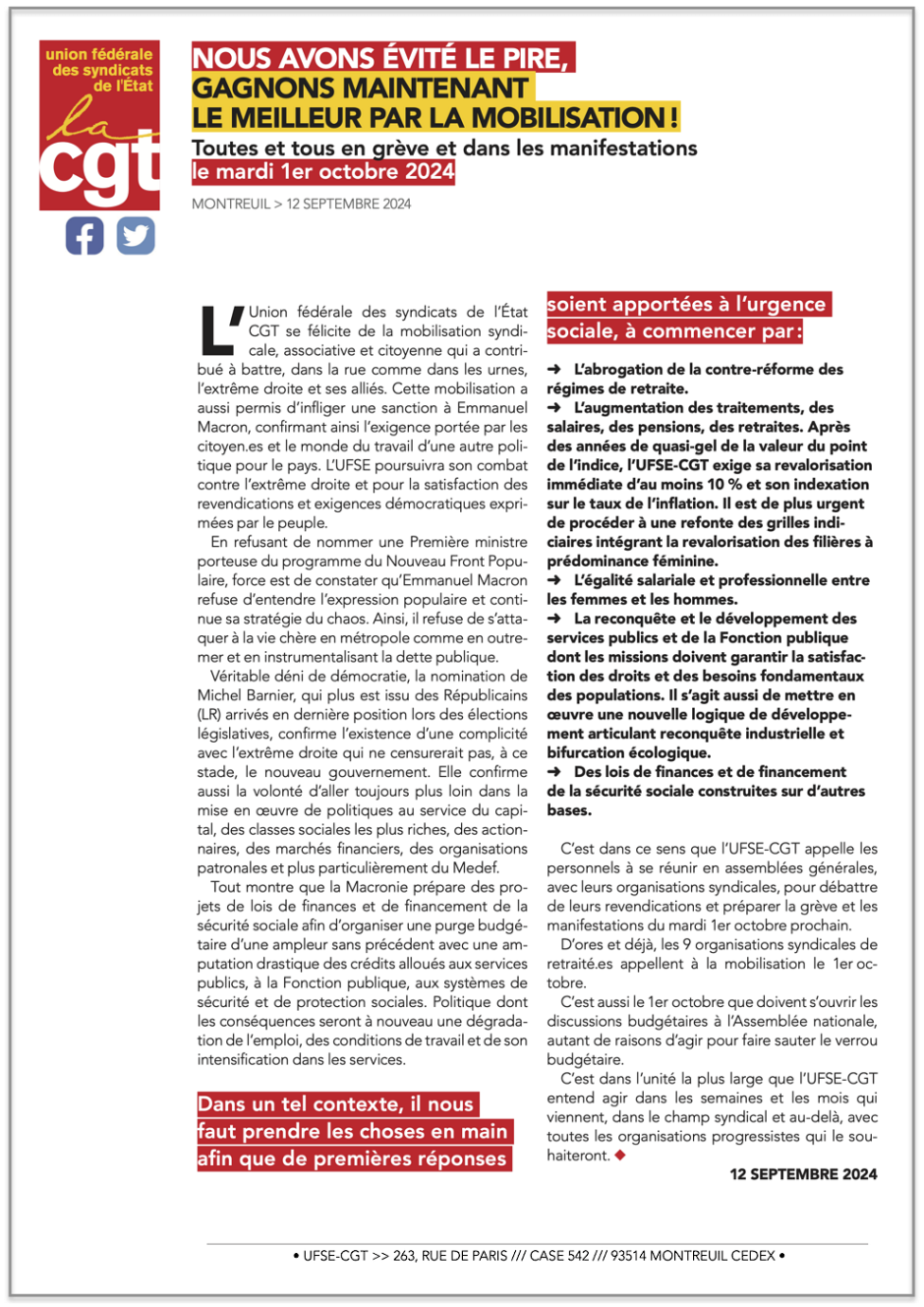 Ci-joint le Tract de l’Union fédérale des syndicats de l’État CGT et le Préavis de grève sur la période du 19 septembre au 31 octobre 2024 pour tous les personnels de la Fonction Publique d’État, ainsi que pour la nuitée en amont et en aval de ces dates.