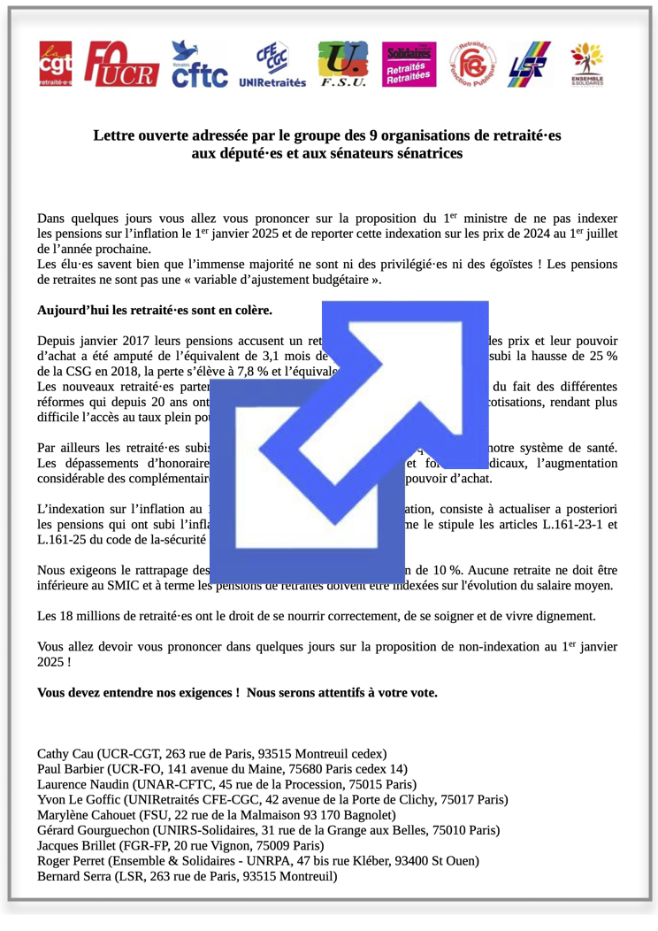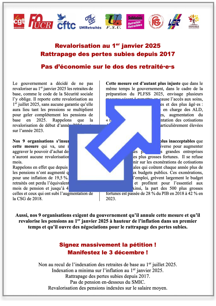 lancée le 18 octobre 2024 par Retraité.es CGT, FO, CFTC, CFE-CGC, FSU, SOLIDAIRES, FGR, LSR, ENSEMBLE ET SOLIDAIRES