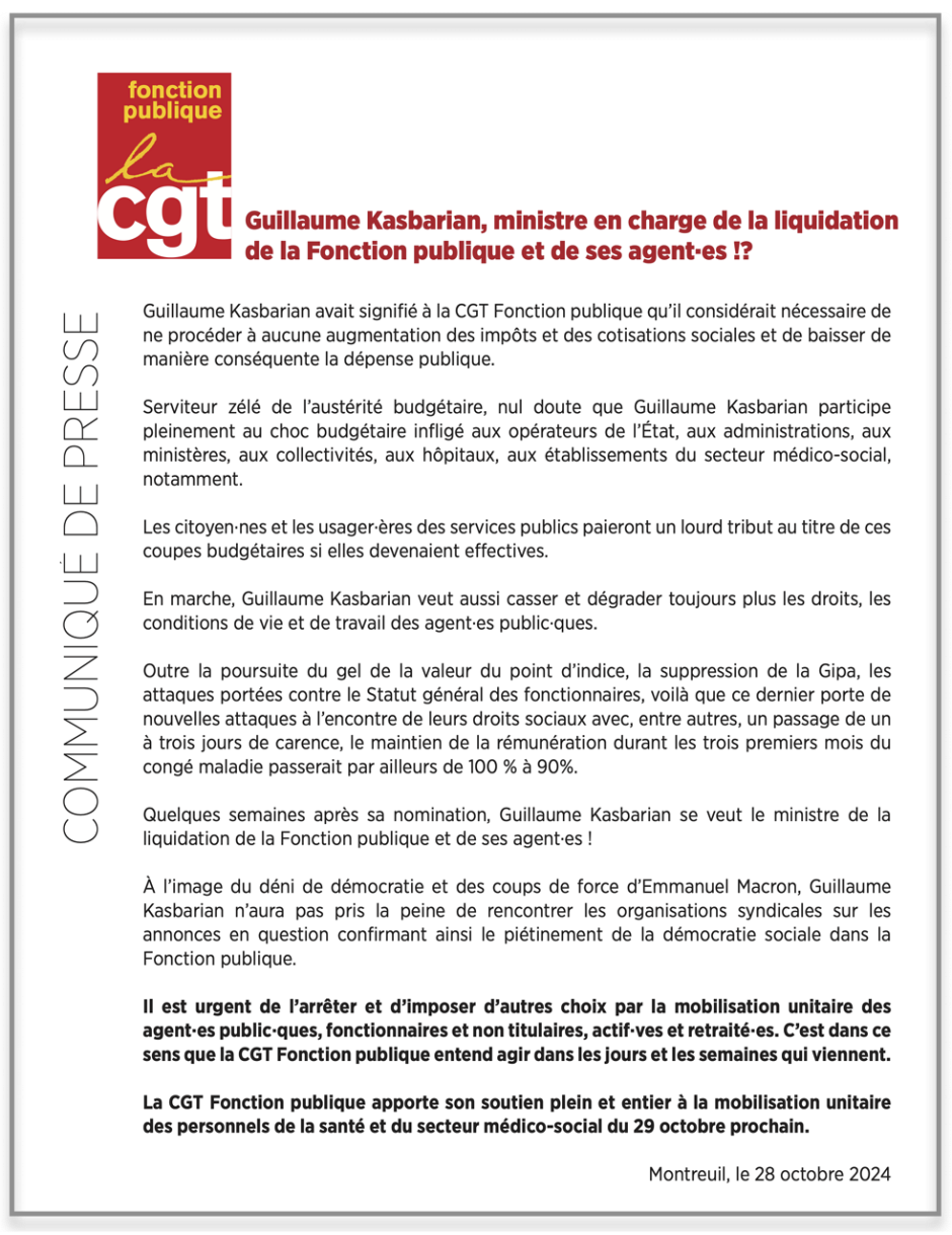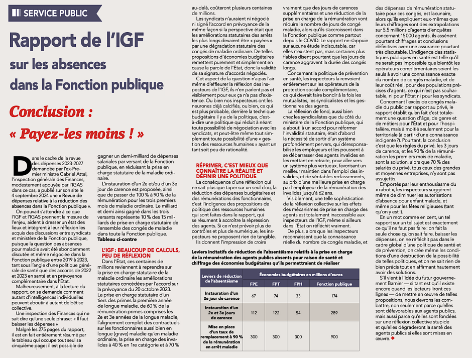 Vous trouverez ci-joint le Communiqué de la CGT Fonction publique du 28 octobre 2024 et un article du journal Le Fonction publique d’août-sept. 2024 : « Rapport de l’IGF sur les absences dans la Fonction publique "Conclusion : Payez-les moins !" »