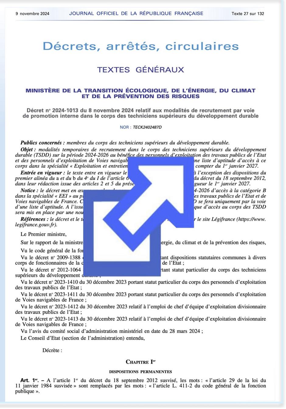 Décret et arrêté du 8 novembre 2024 relatif au plan de requalification d’accès par liste d’aptitude au corps des TSDD dans la spécialité « EEI* » sur la période 2024-2026 au bénéfice des personnels d’exploitation des TPE et de VNF.