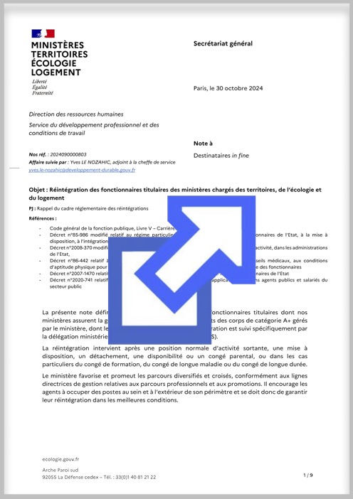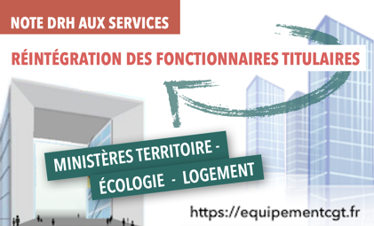 Note DRH aux services ayant pour objet la réintégration des fonctionnaires titulaires des ministères chargés des territoires, de l’écologie et du logement. Son annexe rappelle le cadre réglementaire (détachement, PNA, MAD, disponibilité, congés… ).