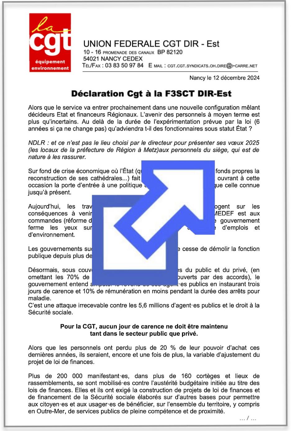 Vous trouverez ci-joint la déclaration CGT faite à la réunion de la F3SCT du CSA (Formation spécialisée santé, sécurité, conditions de travail) de la DIR Est le 12 décembre 2024.