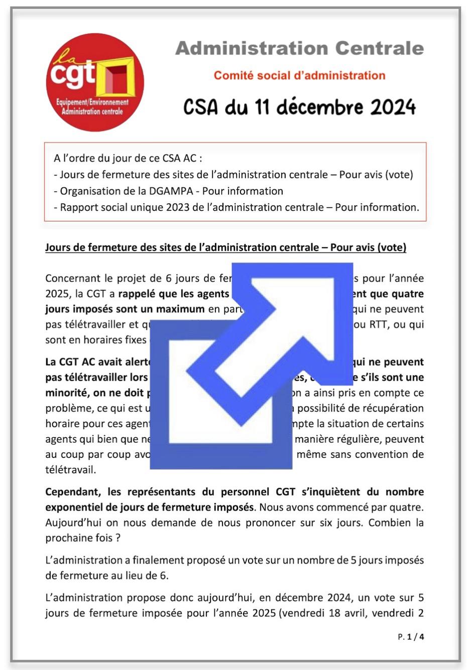 Ci-joint le compte-rendu CGT du Comité Social d’Administration d’AC qui s’est déroulé le 11/12/2024 avec à l’ordre du jour pour avis les jours de fermeture des sites de l’administration centrale, et pour information, l’organisation de la DGAMPA et le RSU 2023 (Rapport Social Unique) de l’administration centrale.