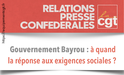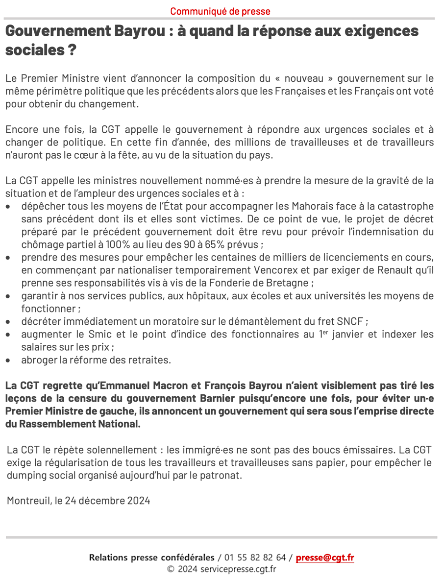 (...) La CGT regrette qu’Emmanuel Macron et François Bayrou n’aient visiblement pas tiré les leçons de la censure du gouvernement Barnier puisqu’encore une fois, pour éviter une Premier Ministre de gauche, ils annoncent un gouvernement qui sera sous l’emprise directe du Rassemblement National. (...) »