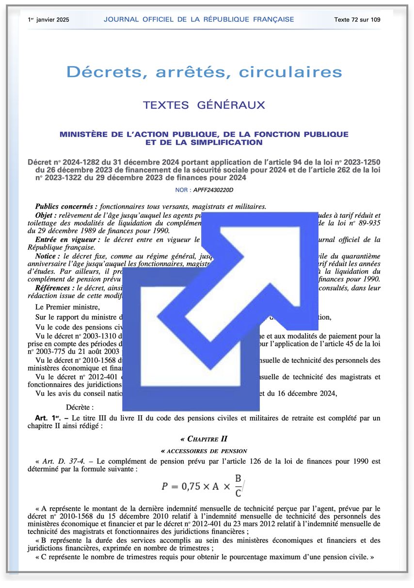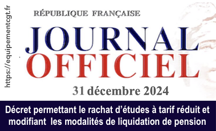 Ci-joint le décret 2024-1282 du 31 décembre 2024 relevant l’âge jusqu’auquel les agents publics peuvent racheter les années d’études à tarif réduit et actualisant les modalités de liquidation du complément de pension, publié au JORF du 1er janvier 2025.
