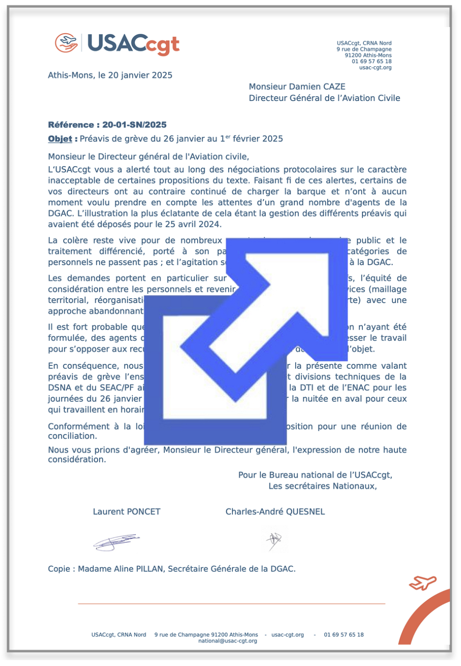 Préavis de grève de l’USAC CGT pour l’ensemble des agents des services et divisions techniques de la DSNA et du SEAC/PF ainsi que l’ensemble des agents de la DTI et de l’ENAC pour les journées du 26 janvier au 1er février 2025, ainsi que pour la nuitée en aval pour ceux qui travaillent en horaires décalés.