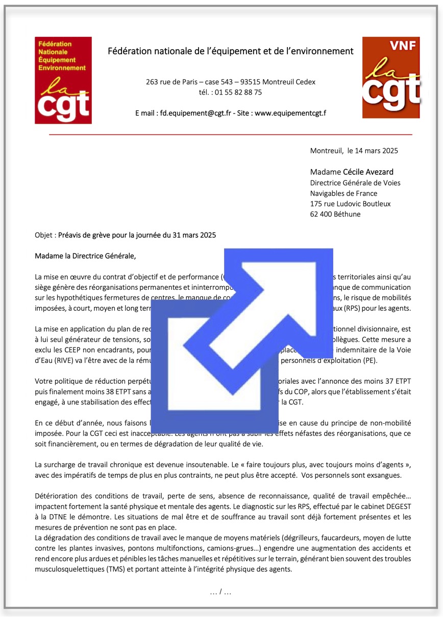 Appel intersyndical CGT et FO à la grève à partir du 18 mars 2025 et Préavis adressé le 11 mars à la Direction Territoriale du Nord Pas-de-Calais pour contrer une énième réorganisation liée au projet de modernisation de la maintenance du réseau fluvial de VNF.