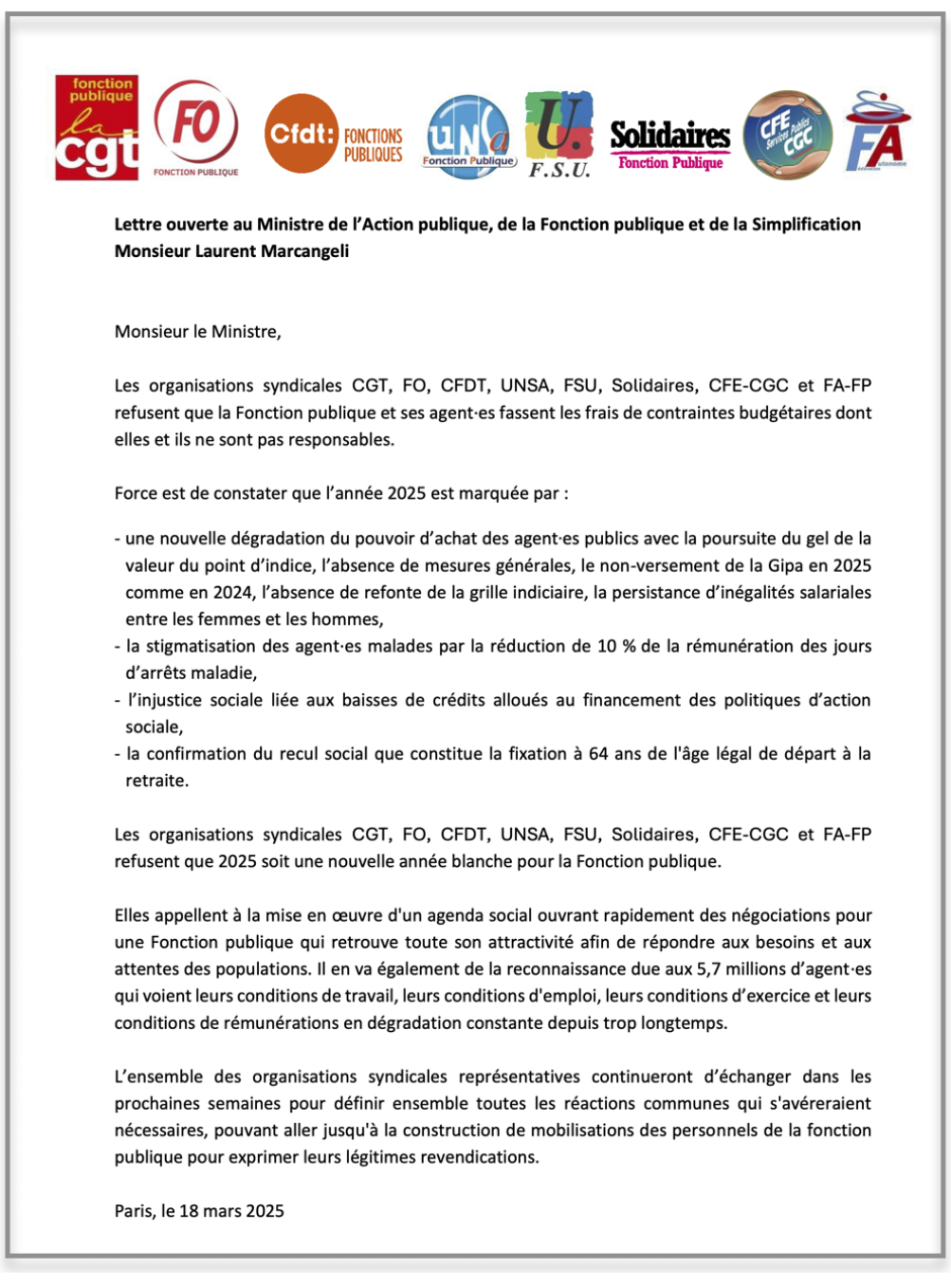 Lettre ouverte des organisations syndicales de la Fonction publique adressée le 18 mars 2025 au ministre de l’action publique, de la fonction publique et de la simplification.