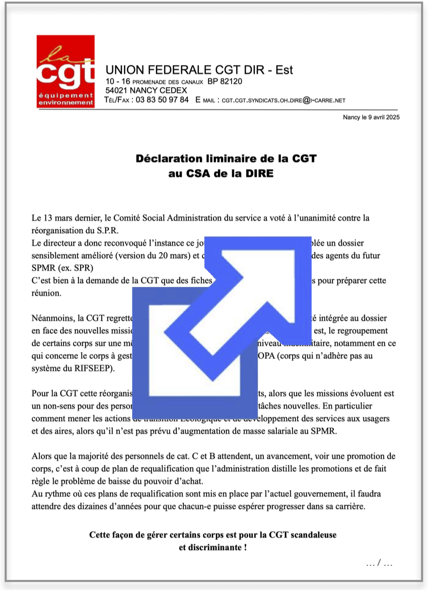 Vous trouverez ci-joint la Déclaration liminaire des représentants CGT au CSA de la DIR-Est du 9 avril 2025 ainsi que le Compte-rendu CGT de sa F3SCT qui s’est tenue le 25 mars dernier, dans le même fichier.