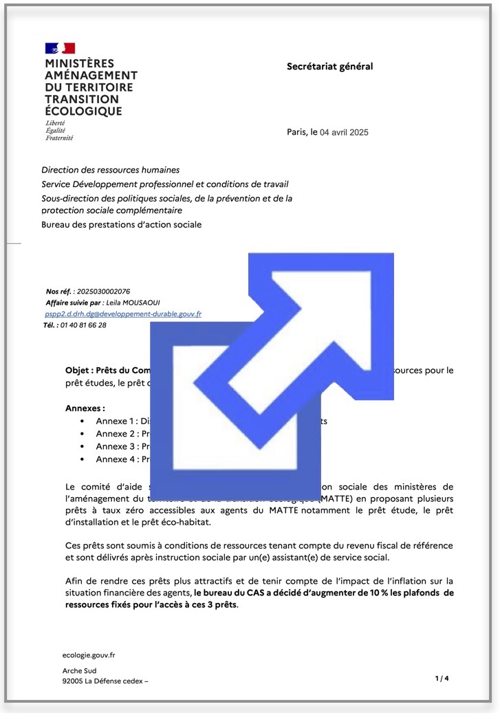 Note DRH du pôle ministériel (04/04/2025) ayant pour objet la revalorisation des plafonds de ressources pour le prêt études, le prêt d’installation et le prêt éco-habitat du Comité d’aide sociale à compter du 1er mai 2025.