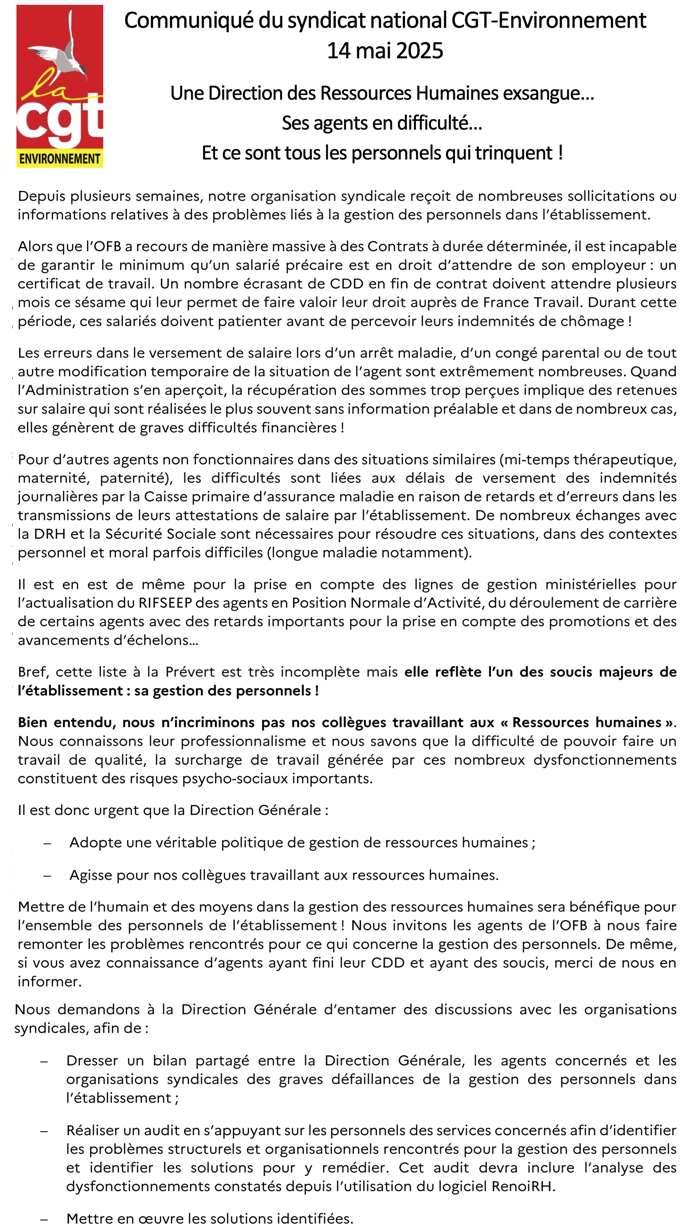 Communiqué du Syndicat national CGT Environnement « Une Direction des Ressources Humaines exsangue... Ses agents en difficulté... Et ce sont tous les personnels qui trinquent ! » le 14 mai 2025.