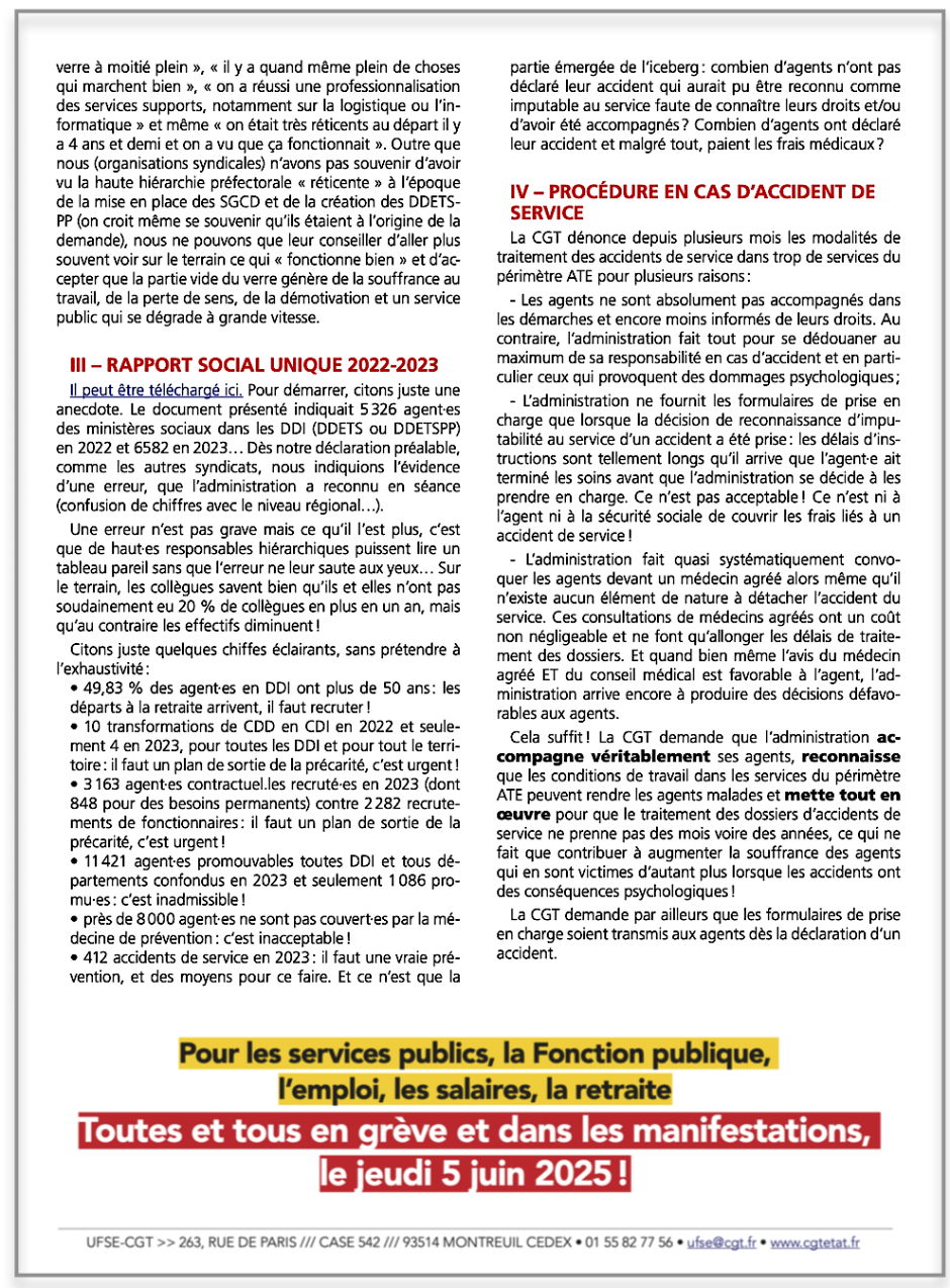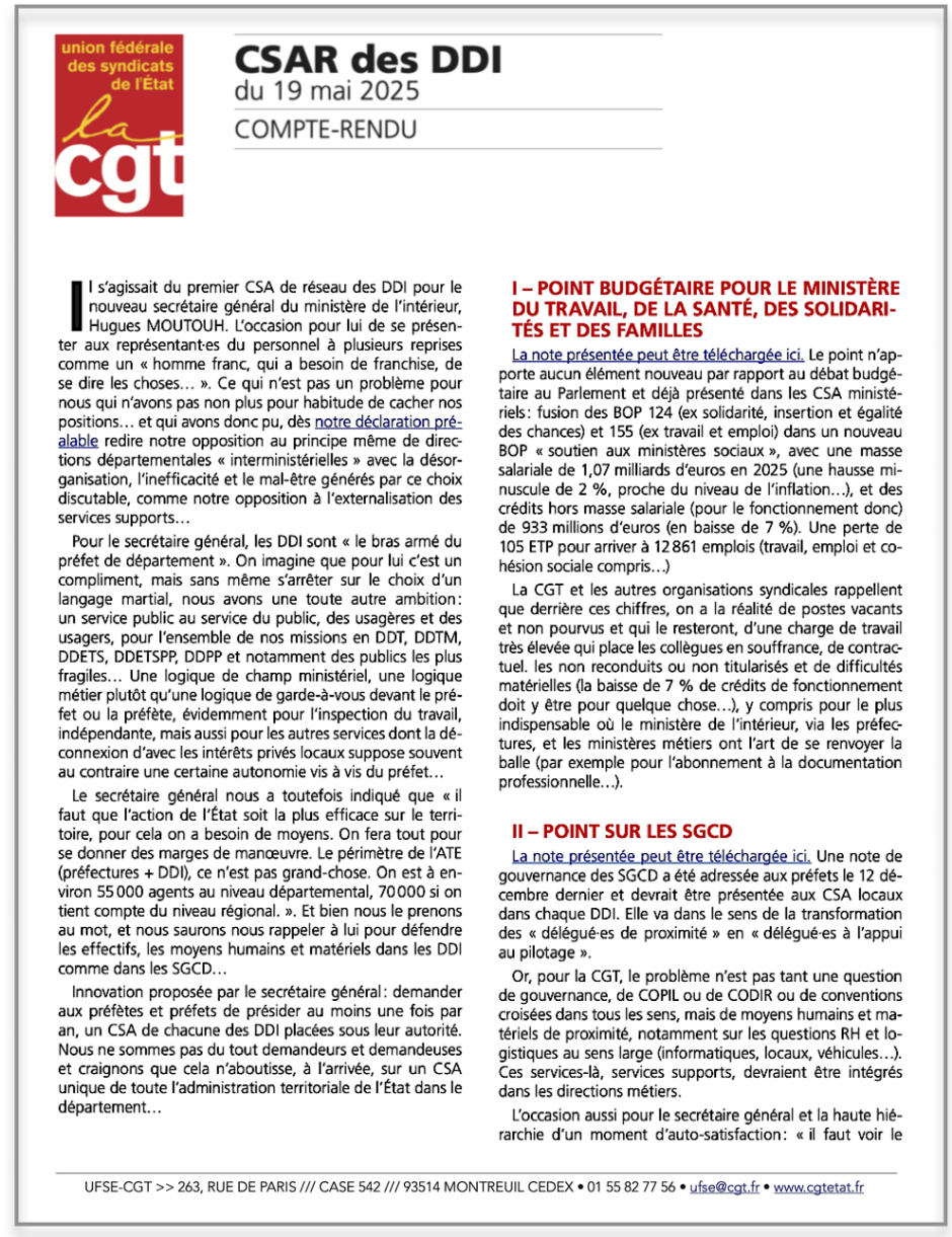 Vous trouverez ci-joint le compte-rendu CGT au CSAr (Comité Social d’Administration de réseau des DDI : DDT, DDT-M ...) du 19 mai 2025, et la déclaration liminaire CGT.
