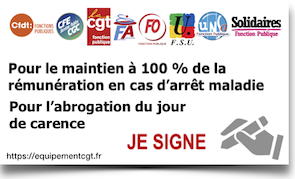 Pétition de l’intersyndicale Fonction Publique « Maintien de la rémunération à 100 % en congé maladie et abrogation du jour de carence ». Signez la pétition en ligne : https://www.lespetitions.fr/petition/org/intersyndicale/maintien_remuneration_cmo