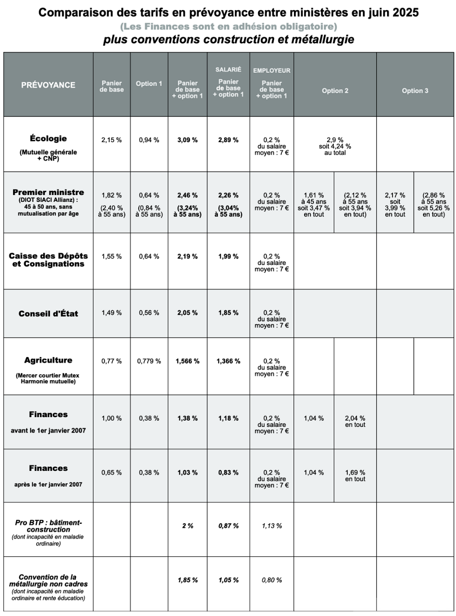 Vous trouverez ci-joint un tableau comparatif des tarifs de prévoyance entre différents ministères et conventions collectives, en vigueur au mois de juin 2025.