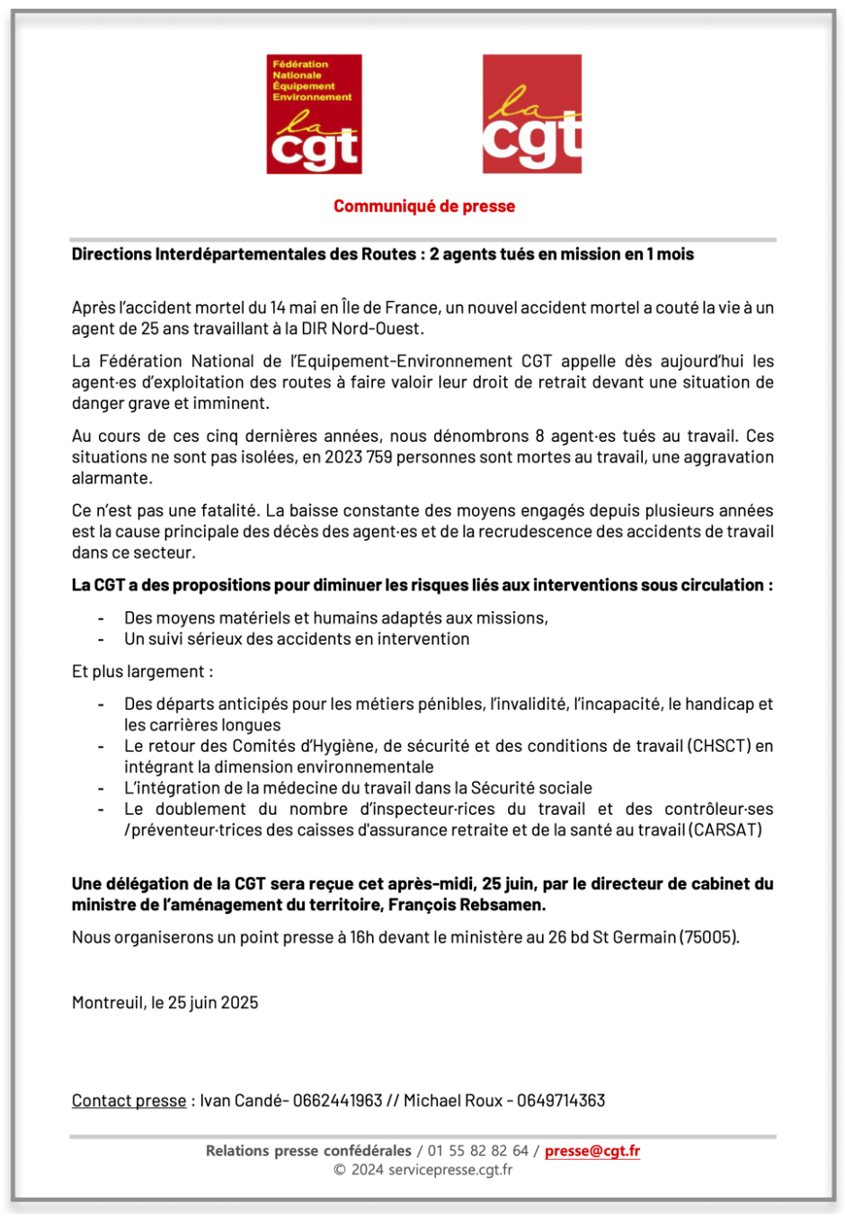 Vous trouverez ci-joint le Communiqué de presse de la CGT et de la Fédération Nationale de l’Équipement et de l’Environnement (FNEE CGT) du 25 juin 2025, rédigé suite aux accidents mortels des agents d’exploitation des Direction interdépartementale des routes ce mois-ci.