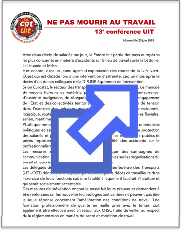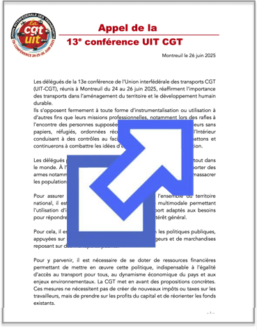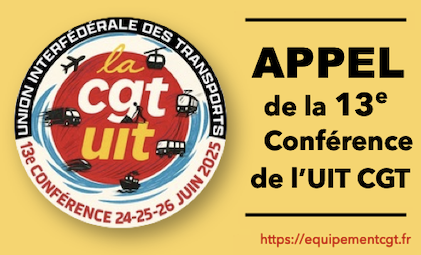 Les délégués de la 13e conférence de l’Union interfédérale des transports CGT (UIT-CGT), réunis à Montreuil du 24 au 26 juin 2025, réaffirment l’importance des transports dans l’aménagement du territoire et le développement humain durable. (Appel ci-joint)