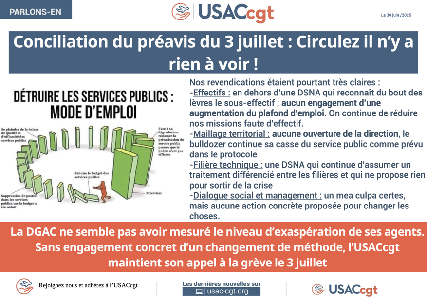 Suite au dépôt du préavis, la conciliation n’a rien changé. La DGAC ne semble pas avoir mesuré le niveau d’exaspération de ses agents. Sans engagement concret d’un changement de méthode, l’USACcgt maintient son appel à la grève le 3 juillet.