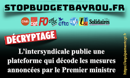 Communiqué commun Cfdt, la CGT, FO, CFE-CGC et CFTC du 09 août 2025 / Plateforme publiée par l’intersyndicale qui décode les mesures annoncées / Pétition « Budget : les sacrifices pour le monde du travail ça suffit ! »
