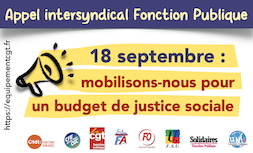 Appel de l’intersyndicale Fonction publique publié le 10 septembre. Les organisations syndicales représentatives de la Fonction publique : CGT, FO, CFDT, Unsa, FSU, Solidaires, CFE-CGC et FA-FP appellent à une journée de mobilisation sur l’ensemble du territoire, le 18 septembre 2025, y compris par la grève et la manifestation.