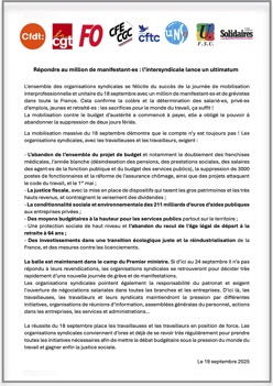 Communiqué du 19 septembre 2025 de l’intersyndicale interprofessionnelle suite à la journée de mobilisation du 18 septembre sur l’ensemble du territoire.