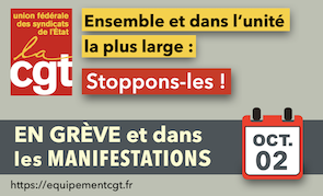 L’Union fédérale des syndicats de l’État CGT considère qu’il faut généraliser la grève. Elle appelle les agentes publicques à se mettre en grève et manifester le 2 octobre 2025 à l’appel de l’intersyndicale ; à se réunir en assemblées générales, dans l’unité syndicale la plus large, pour organiser la riposte, débattre et décider de la grève, du blocage des activités, de la reconduction du processus de mobilisations pour l’inscrire dans la durée.
