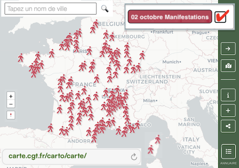Carte générée par la CGT via carte.cgt.fr (mise à jour au fur et à mesure des remontées d’informations) / Visuel intersyndical - Télécharger