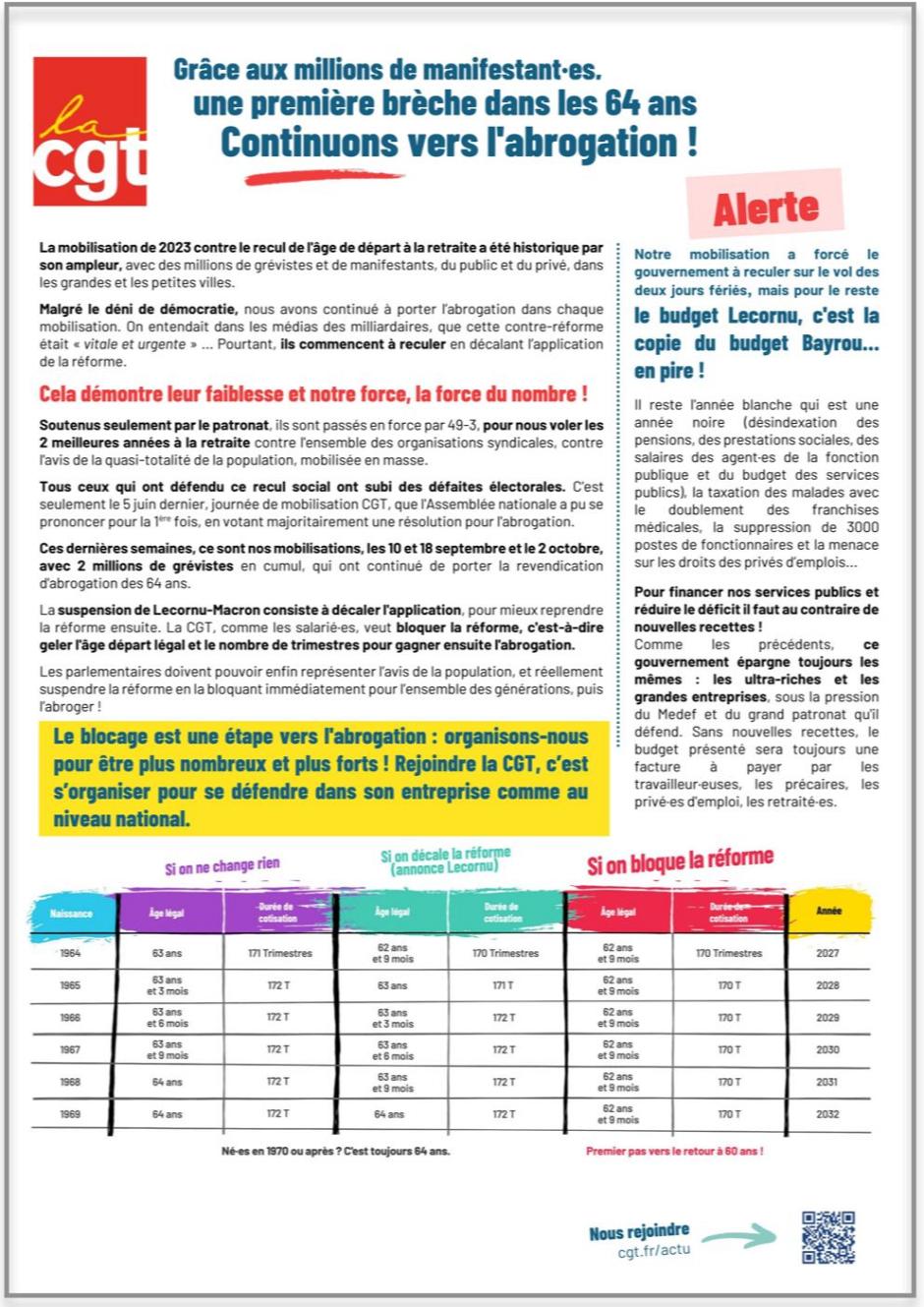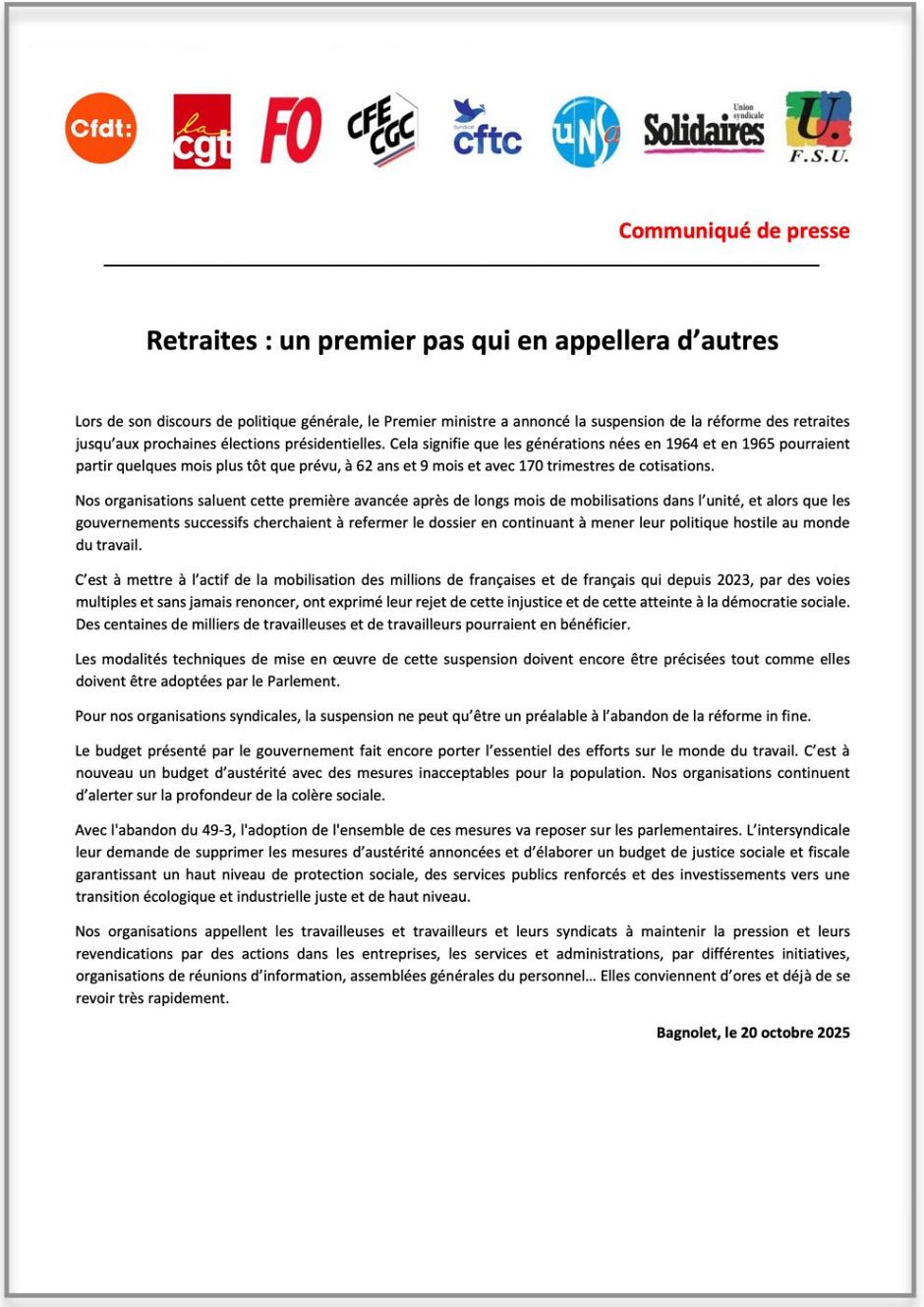 Vous trouverez ci-joint le Tract de la CGT publié le 17 octobre 2025 ainsi que le Communiqué de presse intersyndical du 20 octobre « Retraites : un premier pas qui en appellera d’autres ».