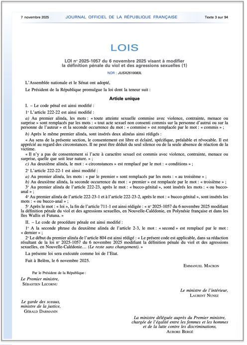 LOI du 6 novembre 2025 visant à modifier la définition pénale du viol et des agressions sexuelles, applicable dès le lendemain de sa publication.