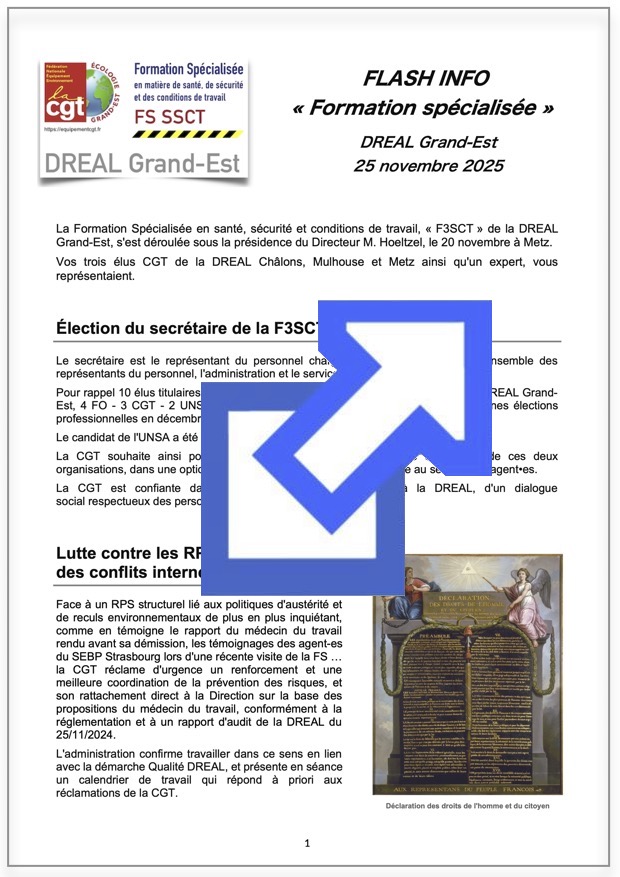 Vous trouverez ci-joint le Flash Infos « Formation spécialisée » de la CGT DREAL Grand-Est du 25 novembre 2025 : Compte-rendu de la réunion de la Formation spécialisée en santé, sécurité et conditions de travail convoquée le 20 novembre 2025 à Metz.