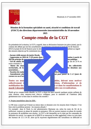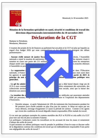 Déclaration et Compte-rendu CGT de la réunion de la Formation spécialisée en matière de santé, sécurité et conditions de travail, du CSA de réseau des directions départementales interministérielles le 18 novembre 2025.