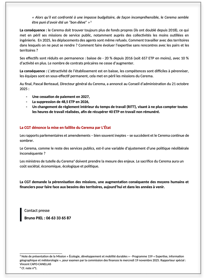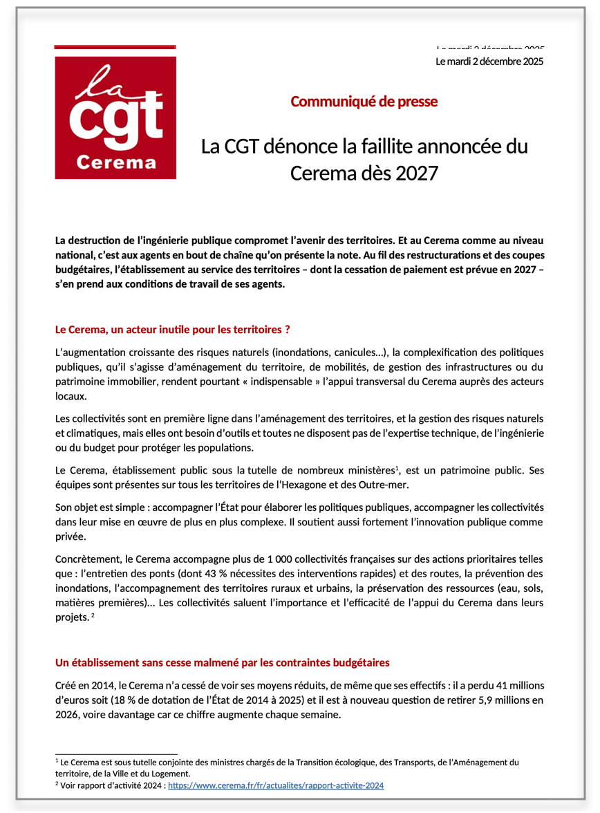 Vous trouverez ci-joint le Communiqué de presse de la CGT Cerema du 02 décembre 2025.