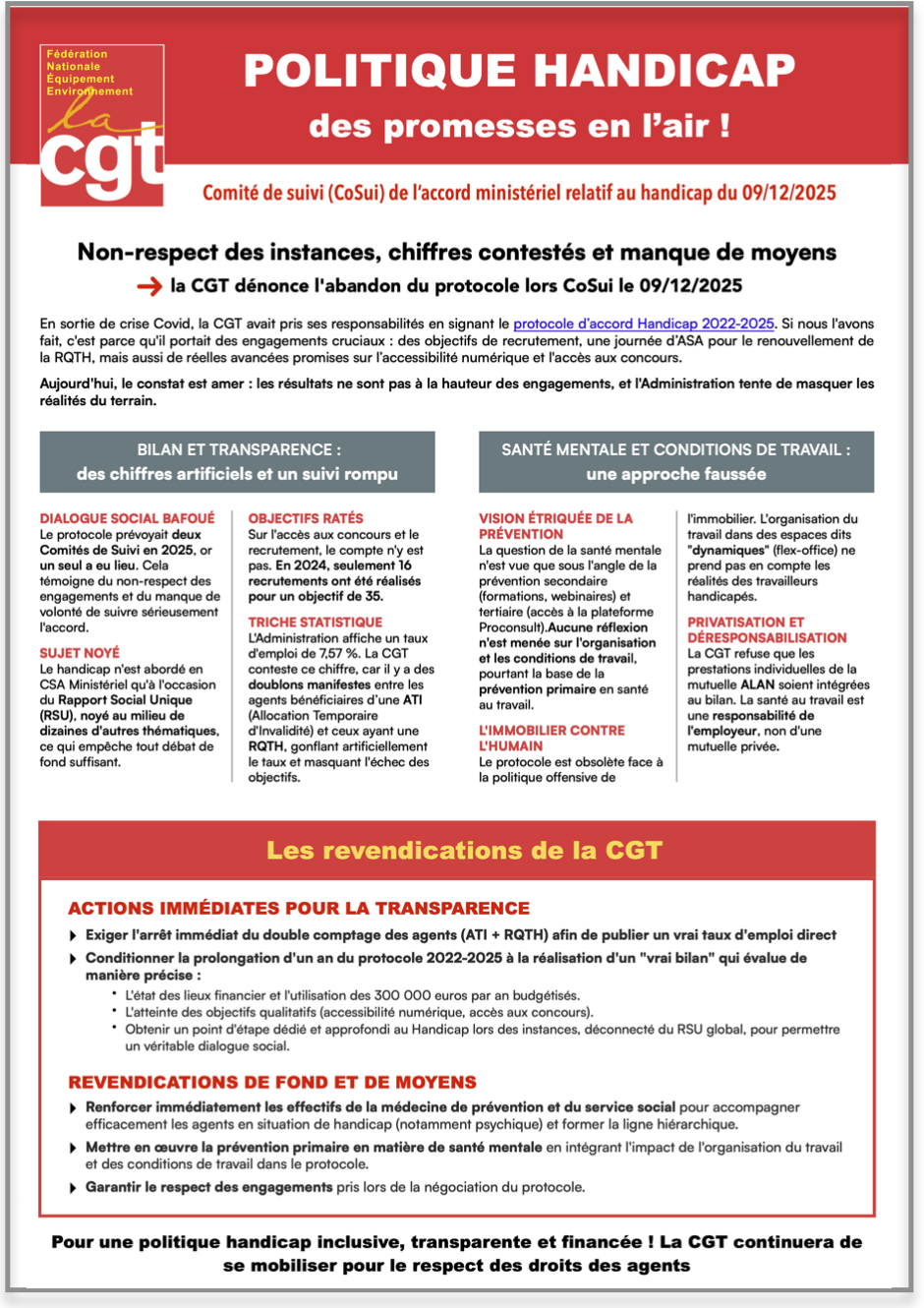 En sortie de crise Covid, la CGT avait pris ses responsabilités en signant le protocole d’accord Handicap 2022-2025 car il portait des engagements cruciaux : des objectifs de recrutement, une journée d’ASA pour le renouvellement de la RQTH, mais aussi de réelles avancées promises sur l’accessibilité numérique et l’accès aux concours.