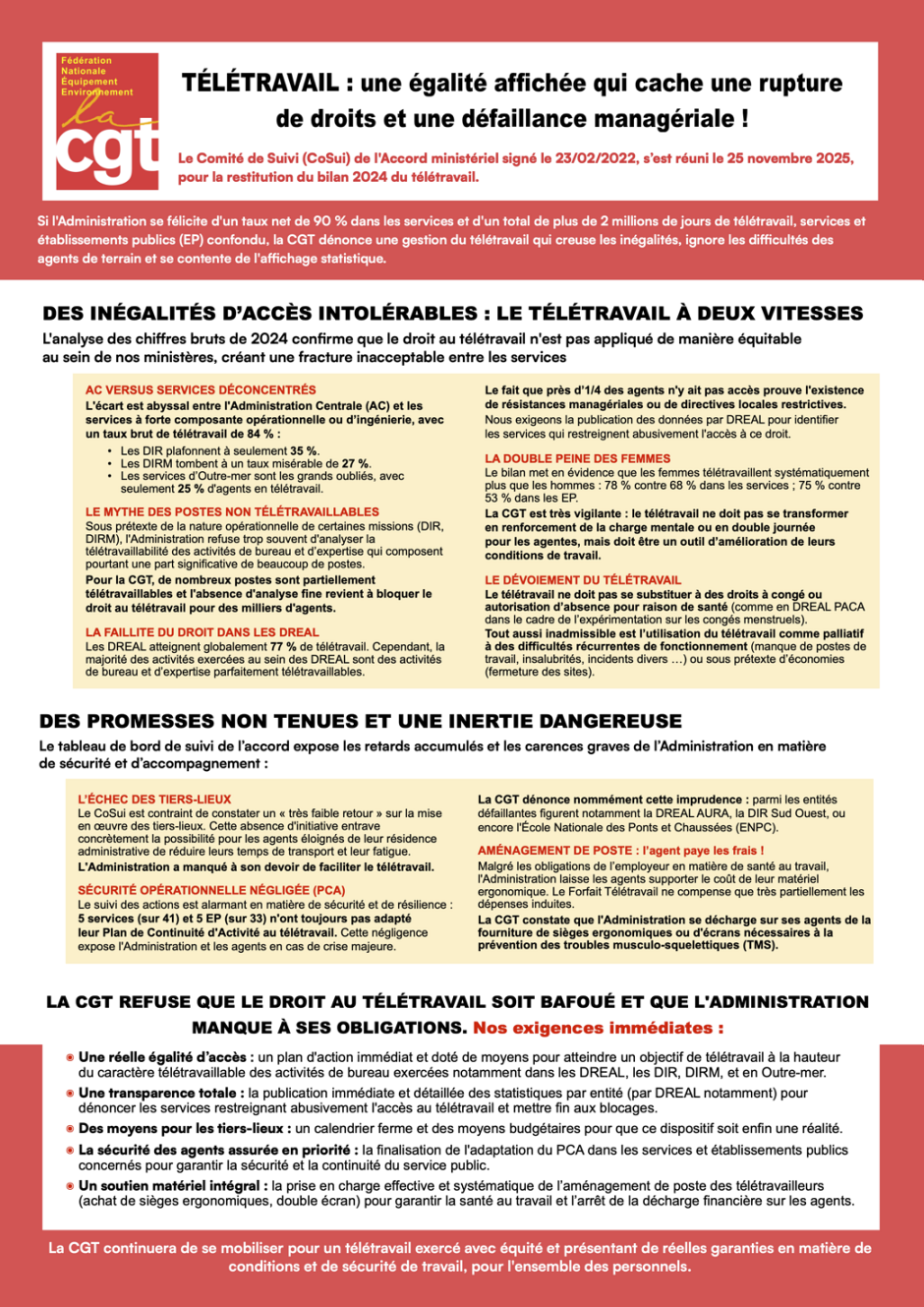 La CGT dénonce une gestion du télétravail qui creuse les inégalités, ignore les difficultés des agents de terrain et se contente de l’affichage statistique : le droit au télétravail est bafoué et l’Administration manque à ses obligations.