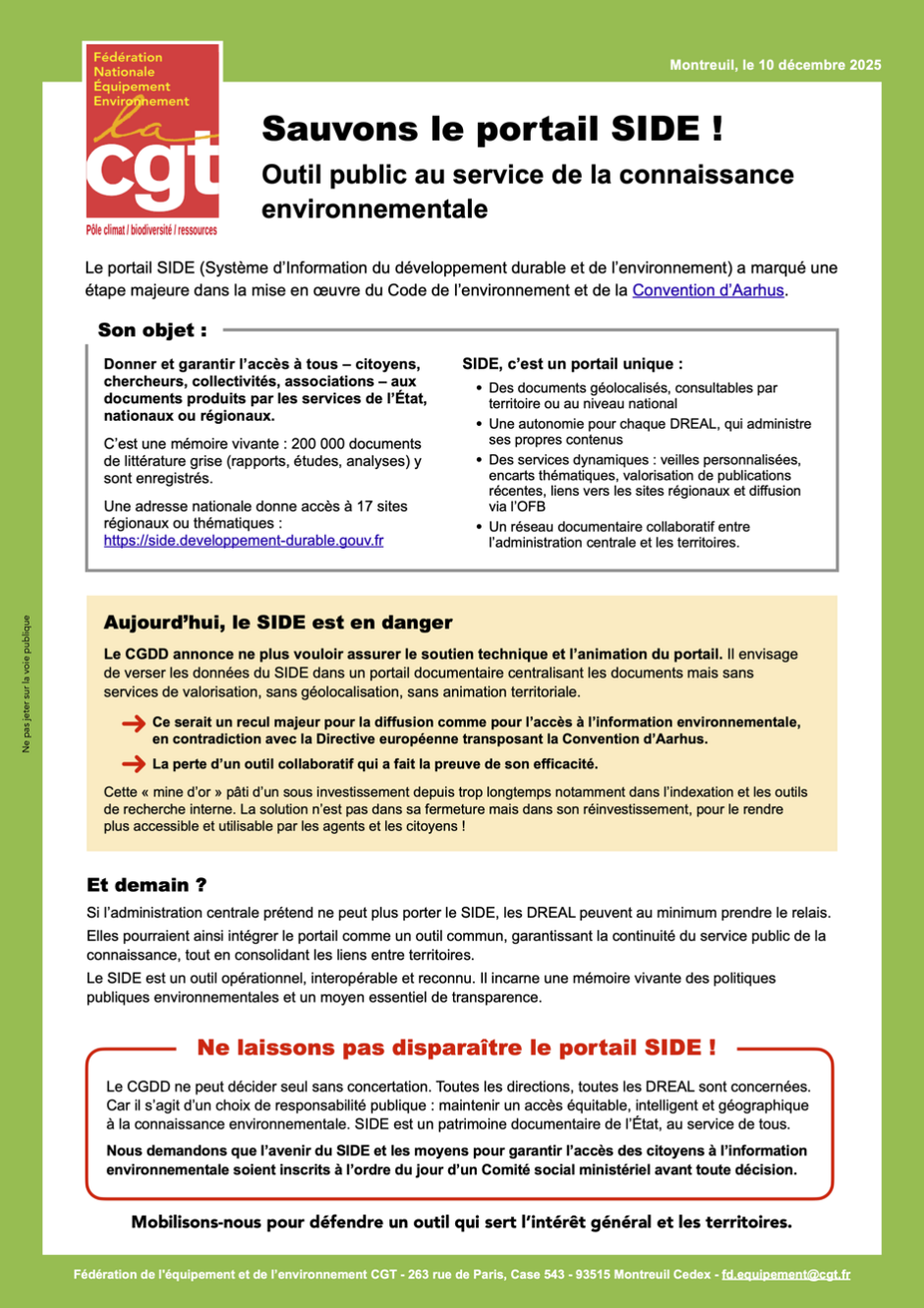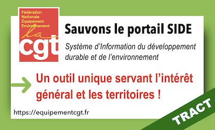 Tract FNEE-CGT pour la défense du portail SIDE (Système d’Information du développement durable et de l’environnement).