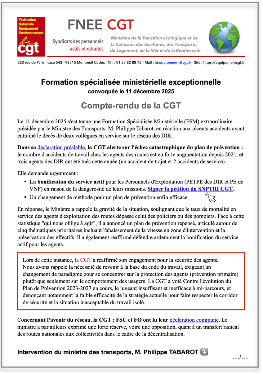 Compte-rendu CGT de la Formation spécialisée ministérielle présidée par le Ministre des Transports, le 11 décembre 2025, en réaction aux récents accidents survenus sur le réseau des DIR (décès de deux collègues en service).