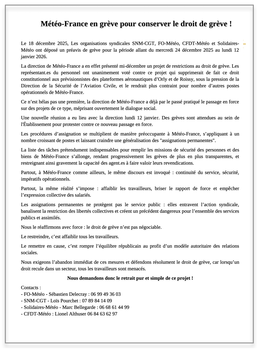 ➡️ Suite à l’échec de la réunion de conciliation le 12 janvier, le préavis de grève a été prolongé et court jusqu’au 31 janvier. Le préavis de grève concerne tous les Météorologistes Conseil Aéronautique de Météo-France.