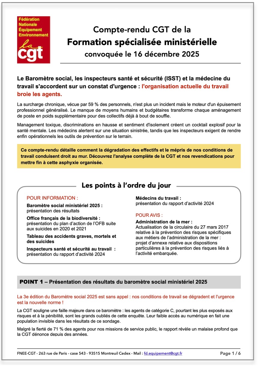 Compte-rendu CGT de la réunion de la Formation spécialisée en matière de santé, de sécurité et de conditions de travail du CSA Ministériel convoquée le 16 décembre 2025, détaillant comment la dégradation des effectifs et le mépris de nos conditions de travail conduisent droit au mur.