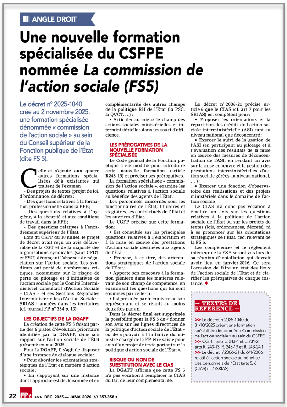 La « Commission de l’action sociale » du Conseil supérieur de la Fonction publique de l’État, 5e formation spécialisée créée par le Décret 2025-1040 du 31/10/2025 - devrait se réunir prochainement et examiner les compétences et le règlement intérieur de la nouvelle instance.
