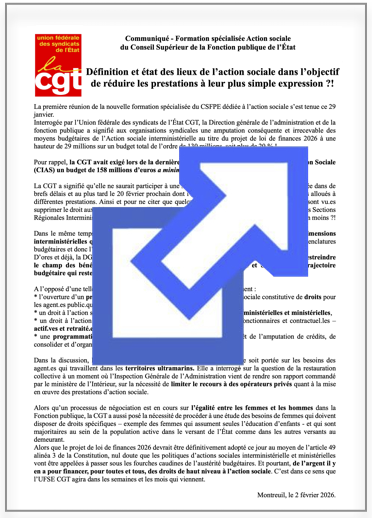 Communiqué CGT suite à la première réunion de la nouvelle « Commission de l’action sociale » du Conseil supérieur de la Fonction publique de l’État, convoquée le 29 janvier.
