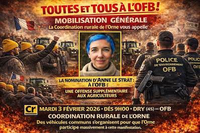 Cette une manifestation a été appelée sur la base d’un tract de mobilisation (reproduit en annexe du présent courrier) qui DÉSIGNE NOMMÉMENT ET PAR SA PHOTOGRAPHIE UNE AGENTE PUBLIQUE, MME ANNE LE STRAT, directrice générale déléguée de l’OFB, la présentant comme une « offense aux agriculteurs » dans une mise en scène visuelle à connotation violente.