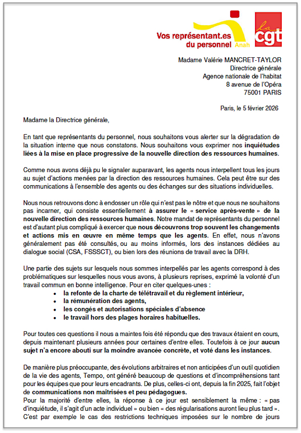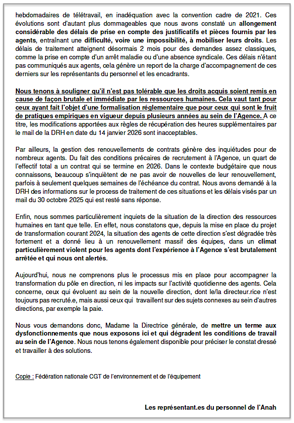 Message des représentants de la CGT-ANAH aux personnels et Courrier du 05 février 2026 à la Directrice de l’agence demandant de mettre fin aux actions intolérables menées par la nouvelle DRH, remettant notamment en question plusieurs droits conquis :