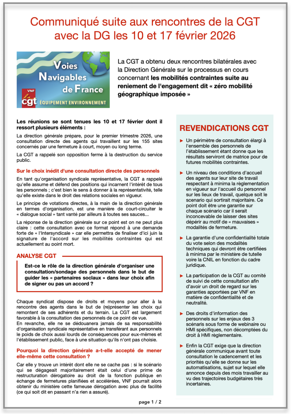Communiqué CGT suite aux deux rencontres bilatérales (les 10 et 17 février 2026) avec la Direction Générale de VNF pour discuter des mobilités contraintes, en réponse à la remise en cause de l’engagement de zéro « mobilité géographique imposée ».