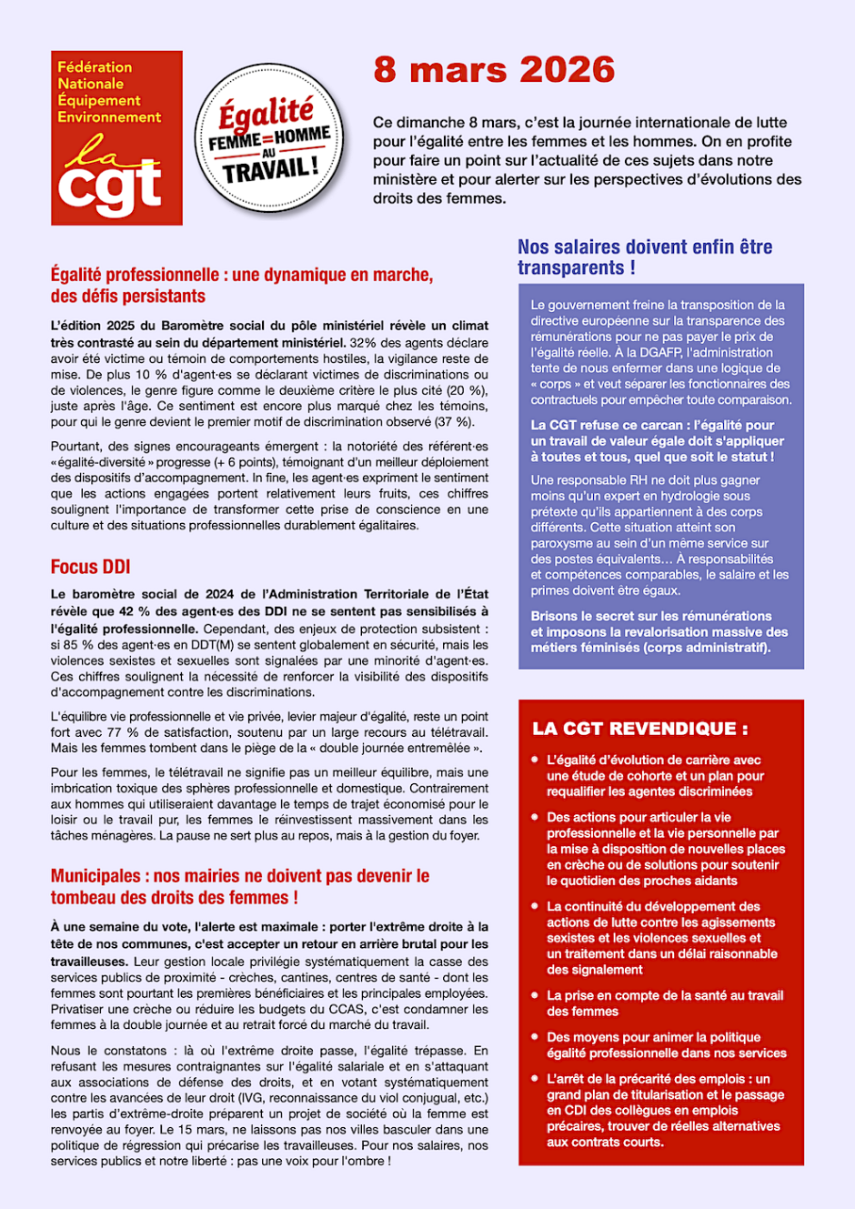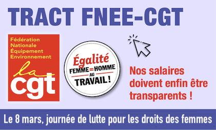 Ce dimanche 8 mars, c’est la journée internationale de lutte pour l’égalité entre les femmes et les hommes. Vous trouverez ci-joint le tract de la FNEE-CGT réalisé pour cette journée : baromètre social du pôle ministériel, baromètre social des DDI, municipales, transparence des rémunérations (...)