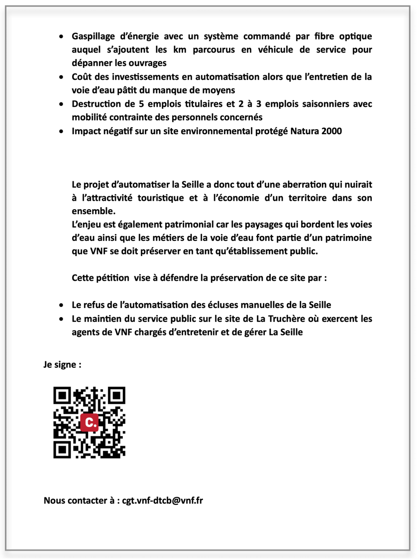 Cette pétition lancée par la CGT VNF vise à défendre la préservation de ce site par :