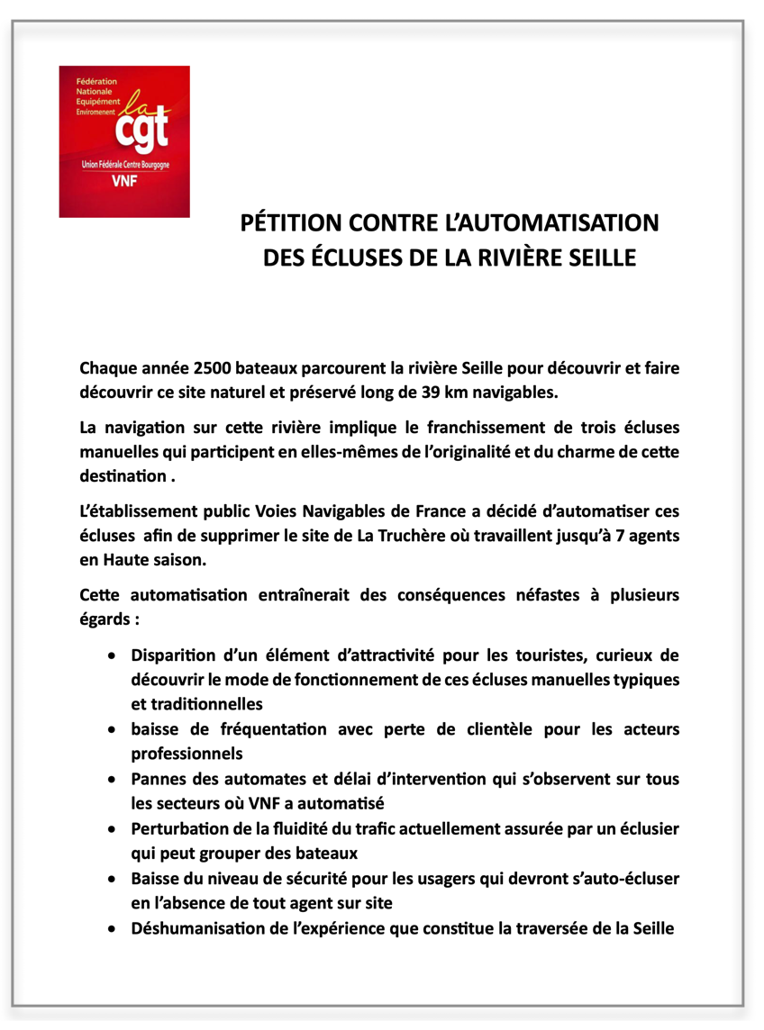 Pétition et Communiqué CGT VNF relatif au rassemblement organisé le 4 mars contre l’automatisation de trois écluses de la rivière Seille et la fermeture du site de La Truchère.