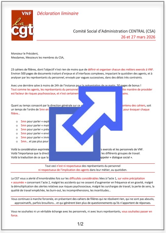 Déclaration de la CGT prononcée en préalable au Comité Social d’Administration Central de VNF - Collège des agents publics - qui s’est tenu les 26 et 27 mars 2026.