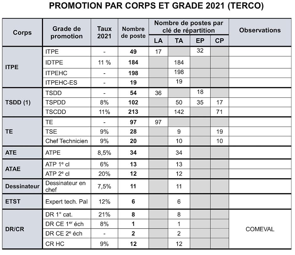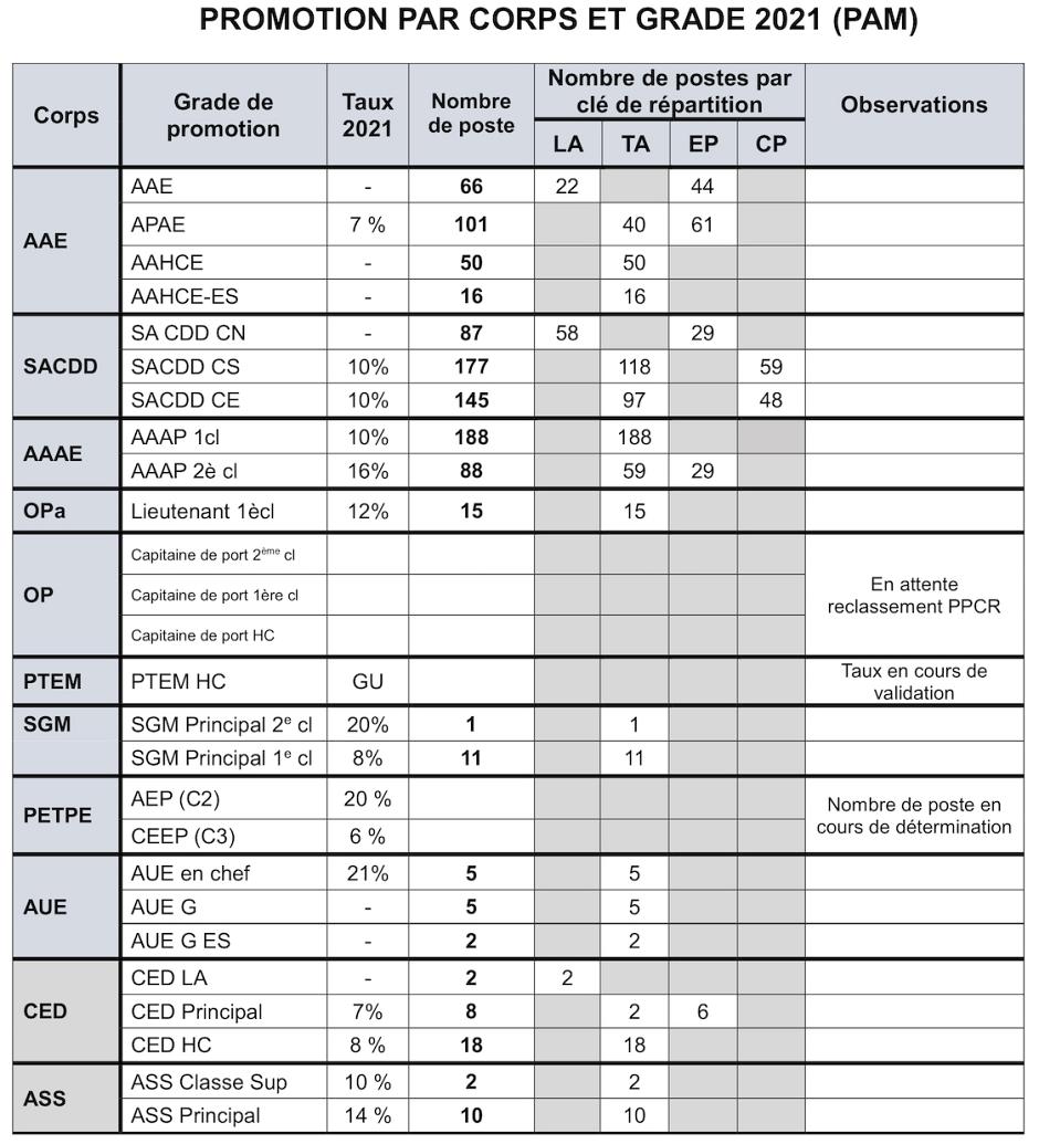 Consulter les taux de promotion 2021 et 2022 ainsi que le nombre de promotions par corps et grades, et par clé de répartition au titre de l’année 2021.
