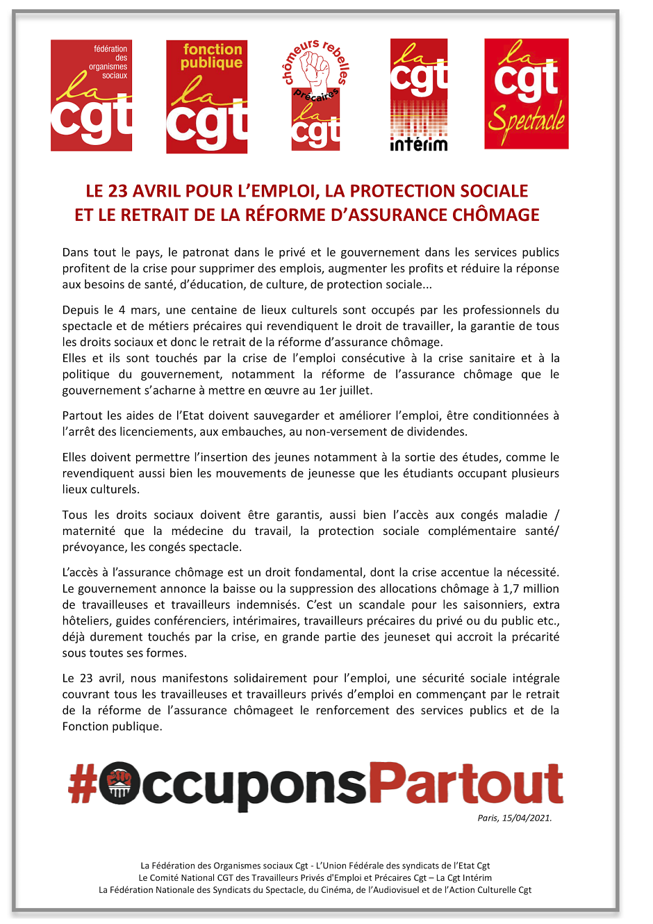 - la Note CGT mise à jour le 06 avril : « Durant le confinement et le couvre-feu, les manifestations revendicatives sont toujours possibles et les déplacements pour s’y rendre aussi ! »