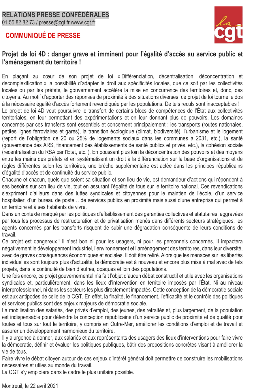 Communiqué de presse CGT du 22 avril 2021 - Calendrier - Proposition de loi « T3D » - Rappel : analyse des élu-e-s CGT au CTM suite à la présentation du projet de loi par la ministre Gourault (MCTRCT)