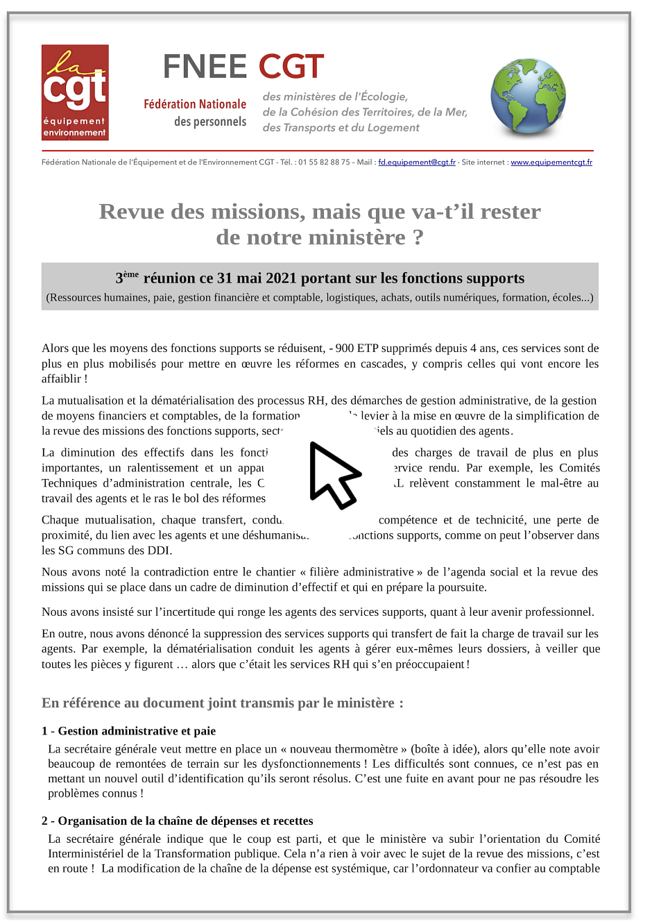Compte-rendu CGT de la troisième réunion sur la revue des missions : programme « Fonctions support », qui s’est déroulée le 31 mai 2021.
